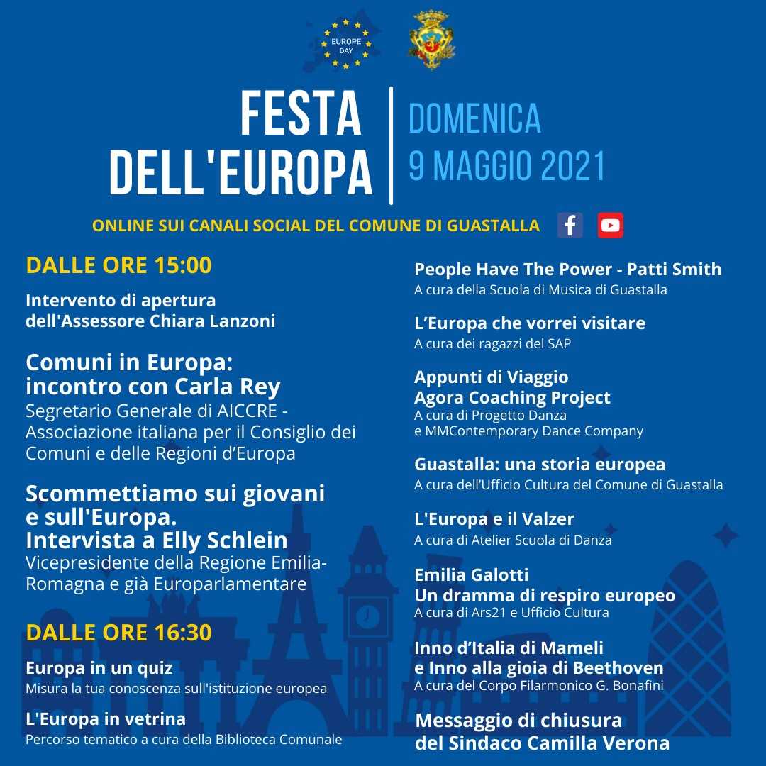 Dalle ore 16:30 si susseguiranno una serie di video e iniziative online proposte da vari soggetti e associazioni. “Europa in un quiz” per misurare la propria conoscenza sull’istituzione europea; “L’Europa in vetrina”: percorso tematico a cura della Biblioteca Comunale con una ricchissima biblio-sitografia per conoscere da vicino e approfondire il tema Europa; “People Have The Power – Patti Smith” a cura della Scuola di Musica di Guastalla; “L’Europa che vorrei visitare”, a cura dei ragazzi del SAP; “Appunti di Viaggio – Agora Coaching Project” a cura di Progetto Danza e MMContemporary Dance Company; “Guastalla: una storia europea” a cura dell’Ufficio Cultura del Comune di Guastalla; “L’Europa e il Valzer” a cura di Atelier Scuola di Danza; “Emilia Galotti. Un dramma di respiro europeo” a cura di Ars21 e Ufficio Cultura; “Inno d’Italia di Mameli e Inno alla gioia di Beethoven” a cura del Corpo Filarmonico G. Bonafini.