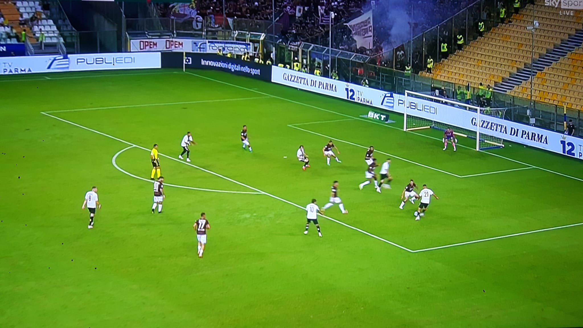 La partita è iniziata con qualche apprensione, prima un sasso scagliato contro il pullman della Reggiana che ha rotto un finestrino, ma fortunatamente nessuno è rimasto ferito. Poi i mille e 200 supporter granata che arrivano in ritardo allo stadio, un po’ per causa di qualche frenata del treno e un po’ per il traffico intasato nei pressi dello stadio. Infine la pioggia di fumogeni, al 99% scagliati in campo dalla curva della Regia, almeno 8 le sospensioni della partita. Alla fine il match è giocato con intensità, e la più nitida occasione è nel primo tempo per il Parma, quando Pettinari toglie dalla porta di Bardi una palla che sarebbe certamente finita in rete.