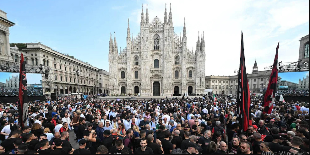 E’ stato un funerale solenne, con lunghi canti gregoriani polifonici, fortemente cattolico, segnato nei gesti e nelle ritualità non solo da tutti i componenti della famiglia Berlusconi, ma anche dalle tante autorità presenti nei primi banchi, dal Presidente Mattarella alla premier Meloni. Poi, fuori, nella piazza, un clima da stadio, tanto caloroso quanto stridente, con un continbuo sventolare di bandiere rossonere che hanno fatto scomparire i rari vessilli di Forza Italia. E con i solenni e dolci canti gregoriani brutalmente mixati con cori da curva sud: da “Un presidente c’è un solo un presidente” a “Berlusconi alé Berlusconi alé oh oh”.
