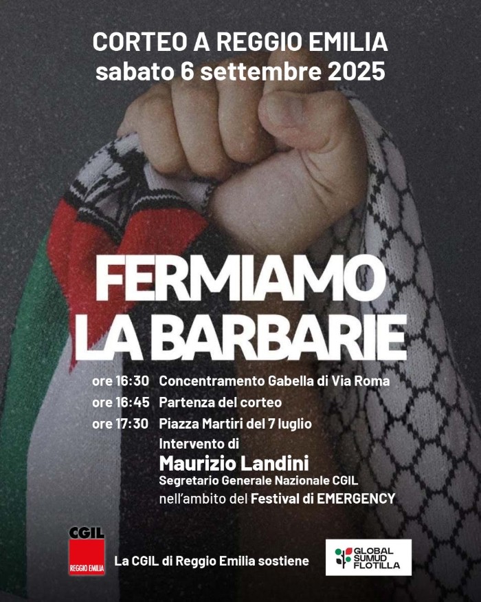Come se non bastasse, nella giornata di sabato 6 settembre anche a Reggio ci sarà un’iniziativa – organizzata dalla Cgil – nell’ambito di “Fermiamo la barbarie”, la giornata di mobilitazione nazionale per la striscia di Gaza e per la Palestina: un corteo che da via Roma si muoverà lungo le vie del centro fino a raggiungere piazza Martiri del 7 luglio – dove alle 17.30, nell’ambito proprio del festival di Emergency, prenderà la parola il segretario generale della Cgil Maurizio Landini.
