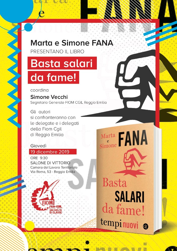 Giovedì 19 dicembre alle 11.30 presso il salone Di Vittorio della Camera del Lavoro di Reggio Emilia (in via Roma 53) è in programma la presentazione – organizzata dalla Fiom-Cgil di Reggio – dell’ultimo libro di Marta e Simone Fana dal titolo “Basta salari da fame!”, edito da Laterza. Gli autori si confronteranno con le delegate e i delegati presenti; coordinerà i lavori Simone Vecchi, segretario provinciale della Fiom-Cgil reggiana.