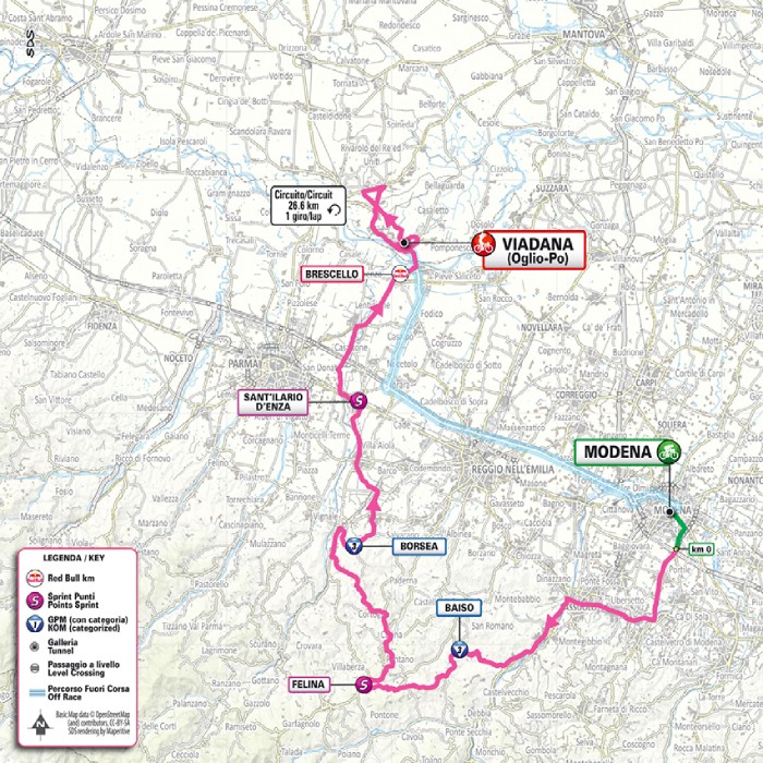 Dopo l’arrivo di mercoledì 21 maggio in piazza Matteotti a Castelnovo ne’ Monti, il Giro d’Italia prosegue con un’altra giornata emiliana: la dodicesima tappa, infatti, è la Modena-Viadana, 172 km complessivi con partenza dal capoluogo di provincia emiliano e arrivo – dopo un altro passaggio attraverso la provincia reggiana – dall’altra parte del fiume Po, nel paese in provincia di Mantova, in Lombardia.