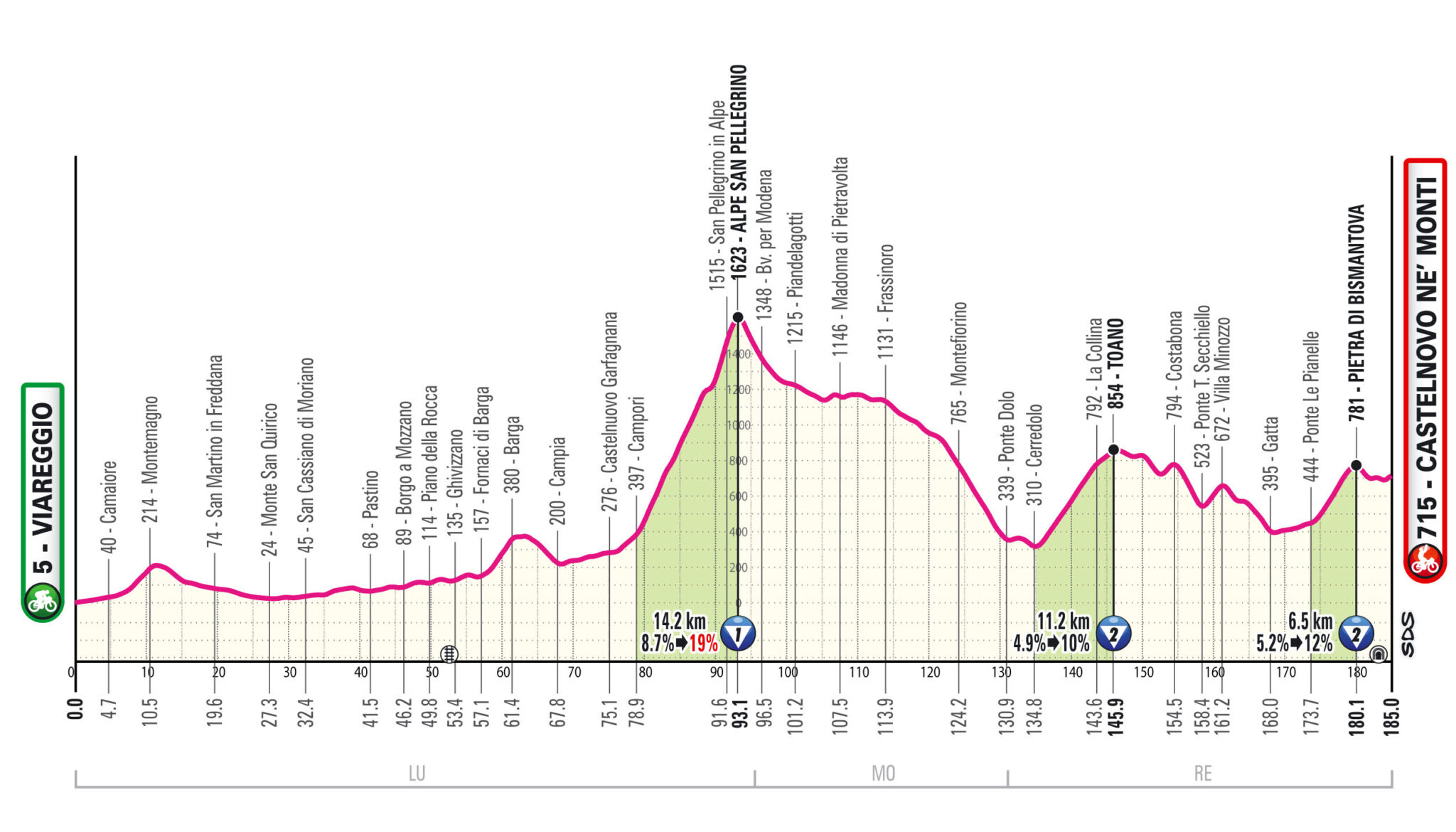 La 108^ edizione del Giro d’Italia partirà il 9 maggio dall’Albania per concludersi il 1^ giugno a Roma. Il 21 maggio l’arrivo in Emilia-Romagna con la 11^ tappa Viareggio-Castelnovo ne’ Monti: 185 km molto mossi fino ai 1.623 metri dell’Alpe San Pellegrino. Tra le località toccate in provincia di Modena e di Reggio Emilia: Piandelagotti, Madonna di Pietravolta, Frassinoro, Montefiorino, Ponte Dolo, Cerredolo, La Collina, Toano, Costabona, Ponte T. Secchiello, Villa Minozzo, Gatta, Ponte le Piadelle, Pietra di Bismantova.