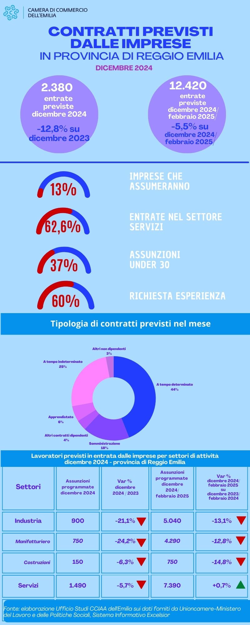 Le attivazioni previste a dicembre si concentreranno per il 62,6% nel settore dei servizi con 1.490 unità (-5,7% rispetto allo stesso mese del 2023) e, in particolare, nei servizi alle imprese (550 unità, -8,3%), alle persone (240 unità e -7,7%), nei servizi turistici, di alloggio e ristorazione (340 nuovi contratti, -2,9%) e nel commercio (360, -2,7%).