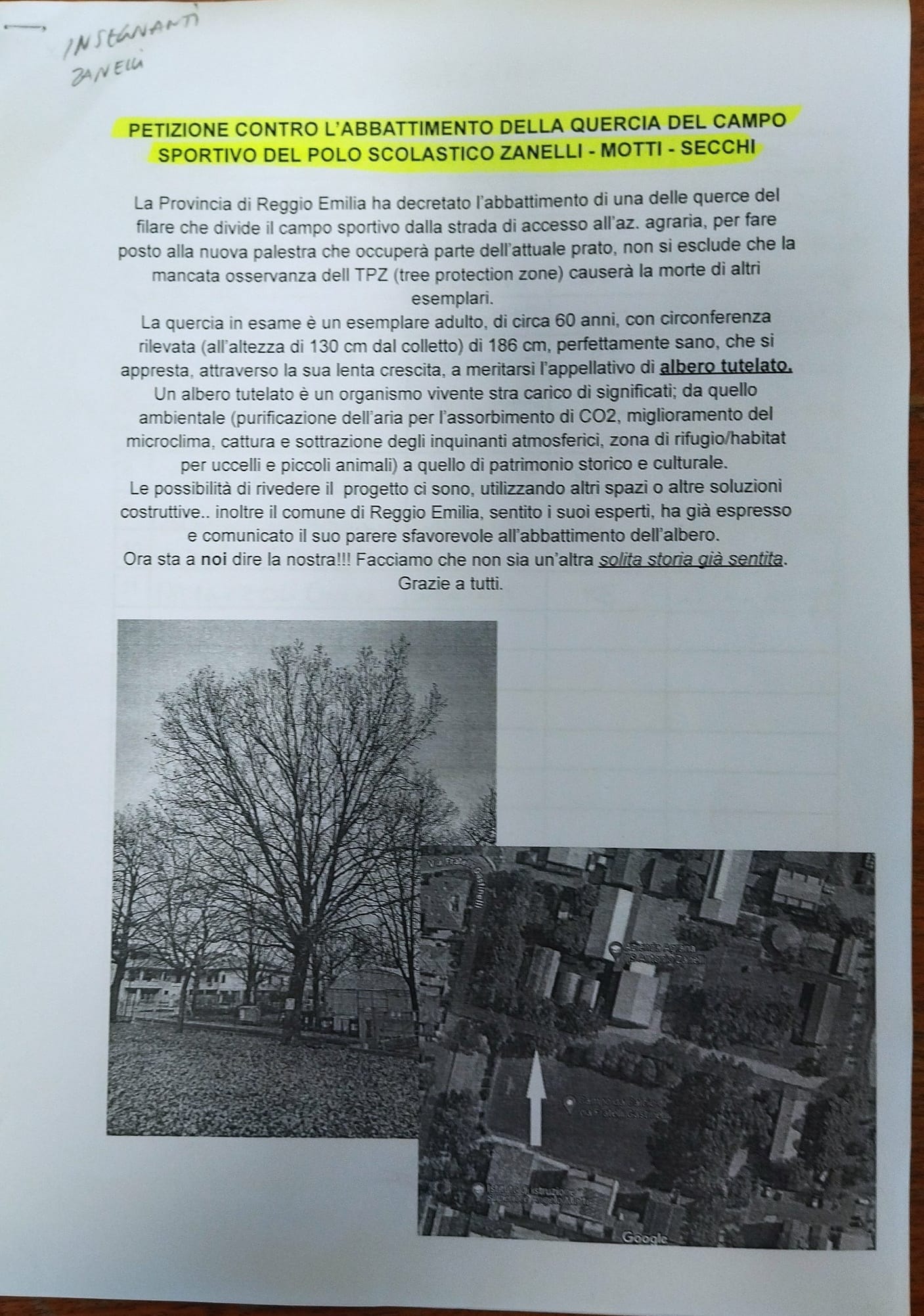 Scrive il professore e botanico reggiano Ugo Pellini: ” Mobilitazione dei cittadini di Coviolo e petizione tra i docenti e studenti dell’istituto d’istruzione superiore Zanelli “contro l’abbattimento della quercia del campo sportivo del polo scolastico Zanelli Motti Secchi”. L’esemplare a rischio è una Farnia (Quercus robur) la tipica quercia di pianura, perfettamente sana, con una circonferenza del tronco di quasi due metri, per un’età superiore ai 60 anni; ha i titoli per essere inserita nell’elenco degli alberi protetti dalla Regione Emilia Romagna.