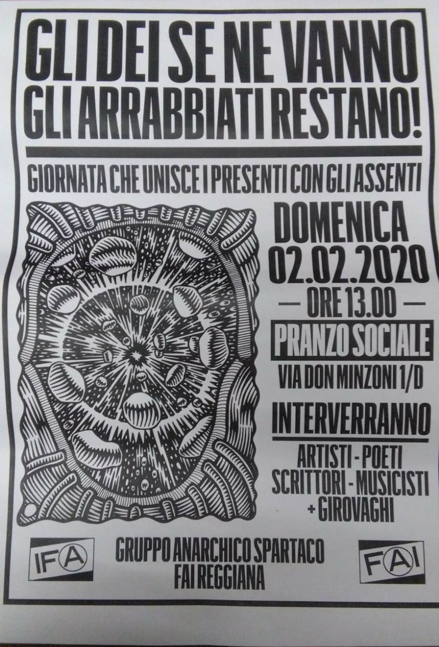 Domenica 2 febbraio ricorderemo i compagni e le compagne che ci hanno lasciato. Con loro abbiamo condiviso, a partire dagli anni ’70, a volte per periodi brevi a volte per momenti lunghi, la comune militanza politica nell’anarchismo e nella FAI Reggiana.