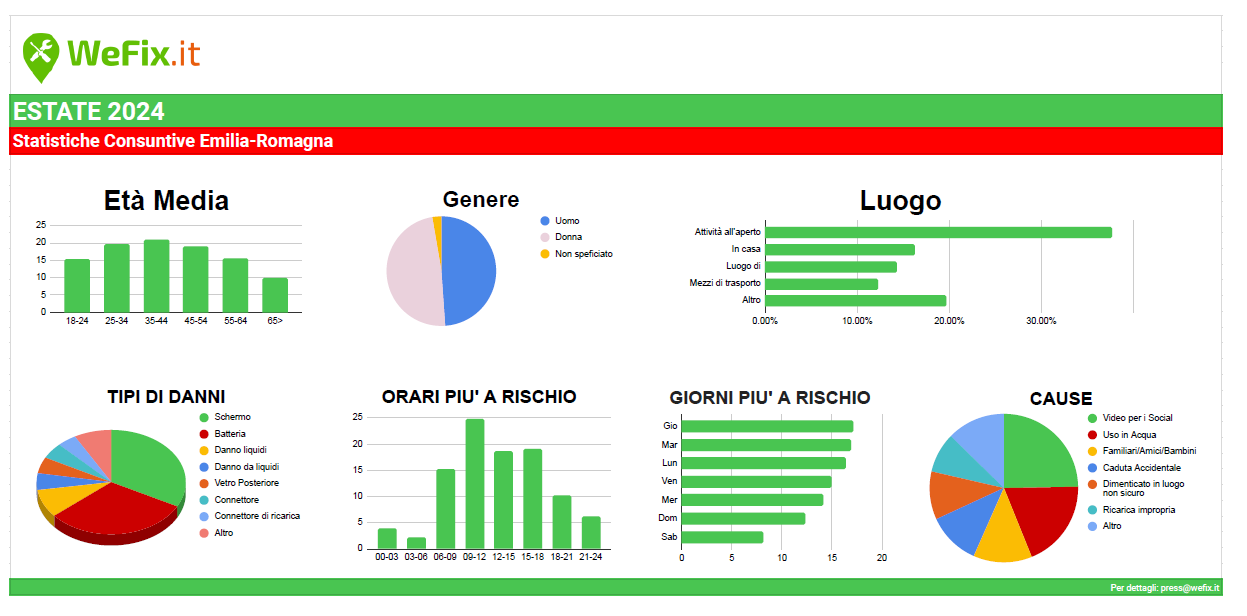 Di contro, le persone con più di 65 anni di età si attestano come le più zelanti con “solo” il 9,8% di richieste di assistenza. Le cause per cui gli emiliani e i romagnoli si sono rivolti ai centri di assistenza per sistemare i propri telefonini sono dovute a “video per i social” (24,7%), “utilizzo in acqua” (19,2%), “familiari, amici e bambini” (19%) e “cadute accidentali” (12%). Nel 37% dei casi, i danneggiamenti sono avvenuti in aree aperte, durante escursioni o in palestra; nel 16% dei casi sono avvenute in casa, mentre nel 12% sui mezzi di trasporto.