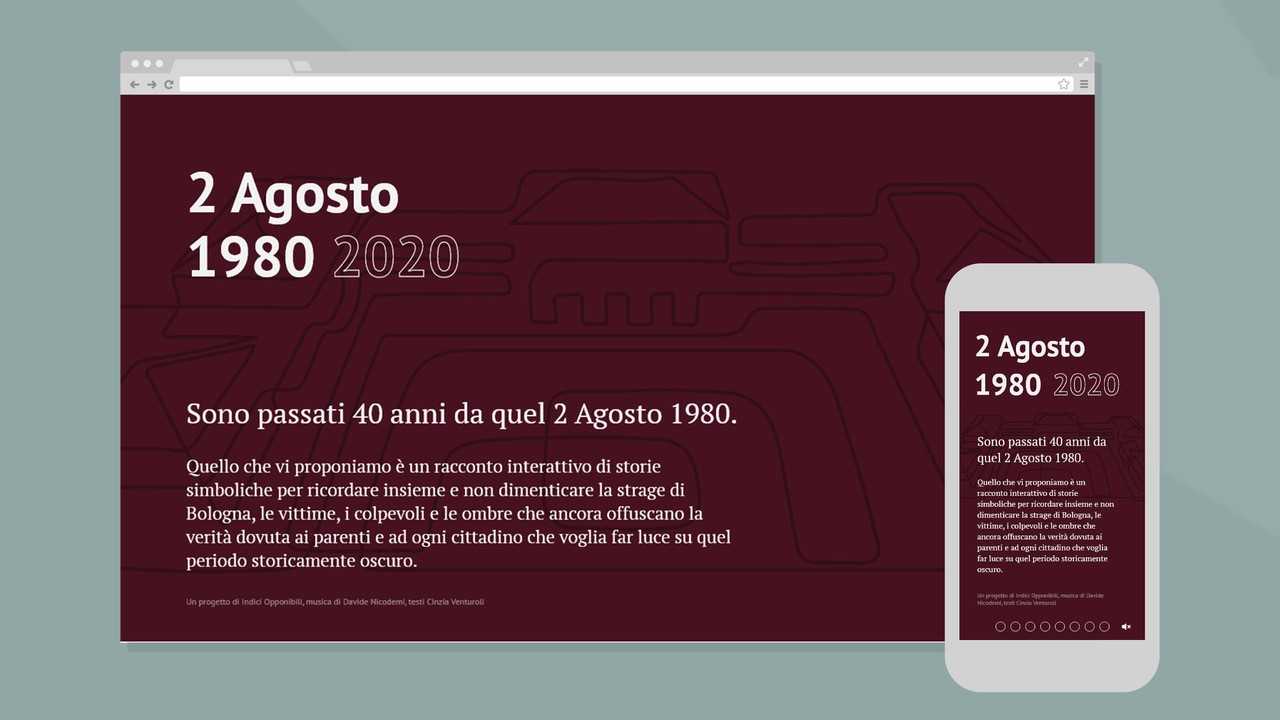 “Il timore che l’emergenza Covid-19 rendesse molto difficile commemorare e organizzare eventi per il quarantesimo della strage del 2 Agosto 1980 ci ha spinto a proporre all’Associazione tra i familiari delle vittime della strage alla stazione di Bologna del 2 Agosto 1980 uno strumento narrativo per ricordare anche online i fatti, le storie, le vittime e i colpevoli emersi da quella vicenda. Un’esperienza che è anche la nostra risposta alla domanda: cosa significa ricordare?” (Andrea Montuschi, Presidente, Indici Opponibili Soc. Coop.)