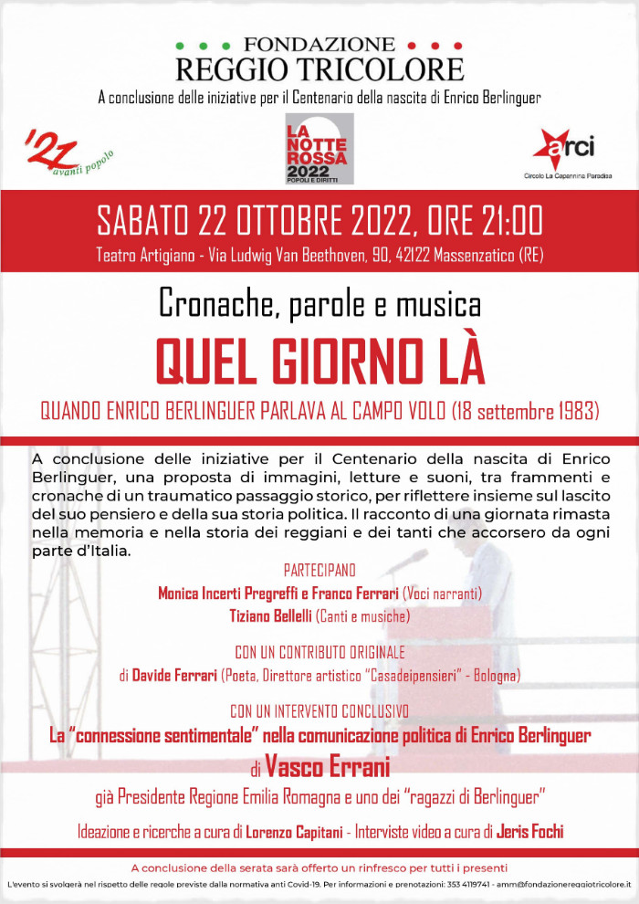 La Fondazione Reggio Tricolore, a conclusione delle iniziative per il centenario della nascita di Enrico Berlinguer, ha organizzato l’incontro dal titolo “Quel giorno là. Quando Enrico Berlinguer parlava al Campo volo (18 settembre 1983)”, in programma sabato 22 ottobre alle 21 al teatro Artigiano di Massenzatico (Reggio Emilia): una serata di immagini, letture e suoni tra frammenti e cronache di un passaggio storico traumatico per riflettere sul lascito del pensiero di Berlinguer e della sua storia politica, con il racconto di una giornata rimasta nella memoria e nella storia dei reggiani e delle tante persone che accorsero a Reggio da ogni parte d’Italia.