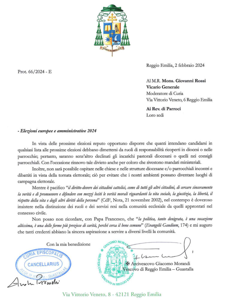 Il cardinale Matteo Zuppi, arcivescovo di Bologna e presidente della Cei, sul Corriere, ha difeso la posizione assunta dall’arcivescovo di Reggio Emilia Giacomo Morandi che nei giorni scorsi, con una lettera, ha imposto a chi ha assunto incarichi nelle parrocchie (catechisti, lettori, consiglieri pastorali) di sospendere il proprio servizio in caso di candidatura alle prossime elezioni di giugno. Lo scritto aveva fatto da subito discutere, tanto che Confcooperative per prima ha chiesto al monsignore di ripensarci.