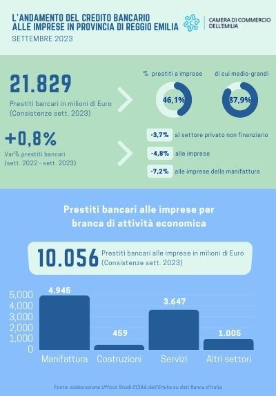 A fine settembre 2023 i prestiti erogati dal sistema di credito nella provincia di Reggio Emilia sono risultati in aumento dello 0,8% rispetto alla stessa data dello scorso anno; gli impieghi bancari si sono così portati a 21,8 miliardi di euro contro i 21,6 miliardi del settembre 2022.