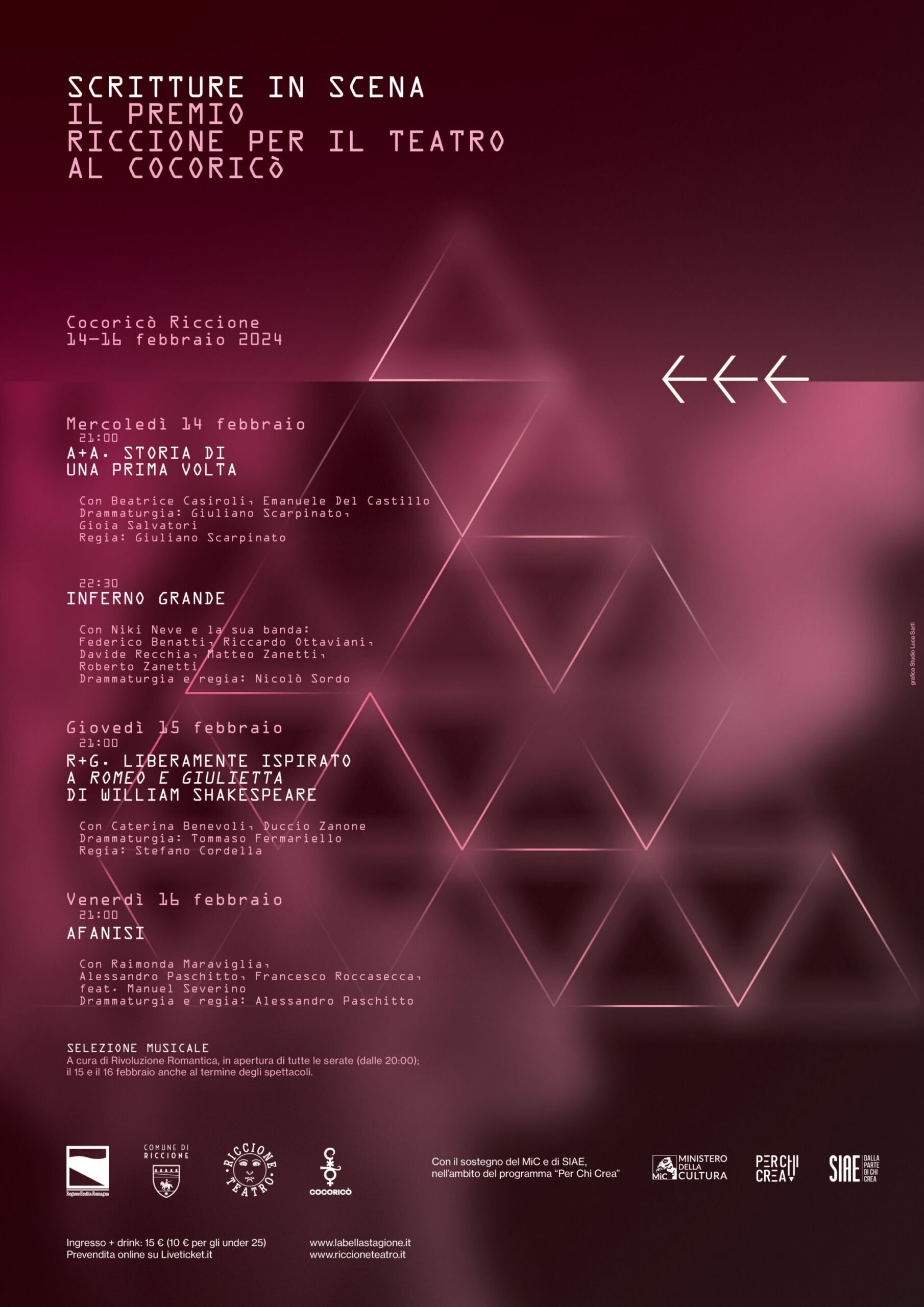L’ingresso alla serata del 14 febbraio include un drink e costa 15 €, con riduzione a 10 € per gli under 25. La prevendita è attiva al Palazzo del Turismo di Riccione (martedì e giovedì, ore 14-18), sul sito Liveticket.it e nelle rivendite Liveticket. I biglietti si possono acquistare in prevendita anche con il sistema pay-by-link, inviando una richiesta via email all’indirizzo stagione@riccioneteatro.it o via WhatsApp al numero 320 0168171.