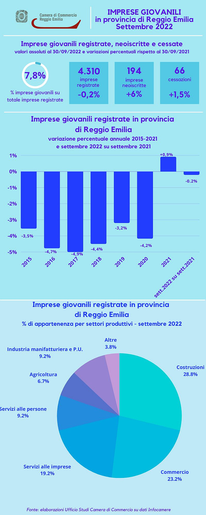 Secondo la rilevazione dell’ufficio studi della Camera di commercio di Reggio (su dati di Infocamere) le imprese giovanili rappresentano il 7,8% del totale di quelle reggiane, una percentuale superiore rispetto alla corrispondente quota regionale (6,9%) non di molto inferiore al dato nazionale (8,4%).