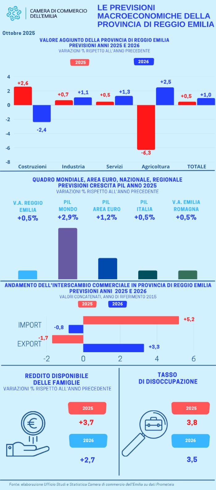 Sono in peggioramento le previsioni relative al Pil reggiano alla fine del 2025. Secondo le elaborazioni della Camera di commercio dell’Emilia sui dati dell’Osservatorio Prometeia, infatti, rispetto al +0,8% preventivato tre mesi fa la stima è ora scesa a +0,5%, in attesa di una crescita un po’ più robusta (+1%) attesa per il 2026.