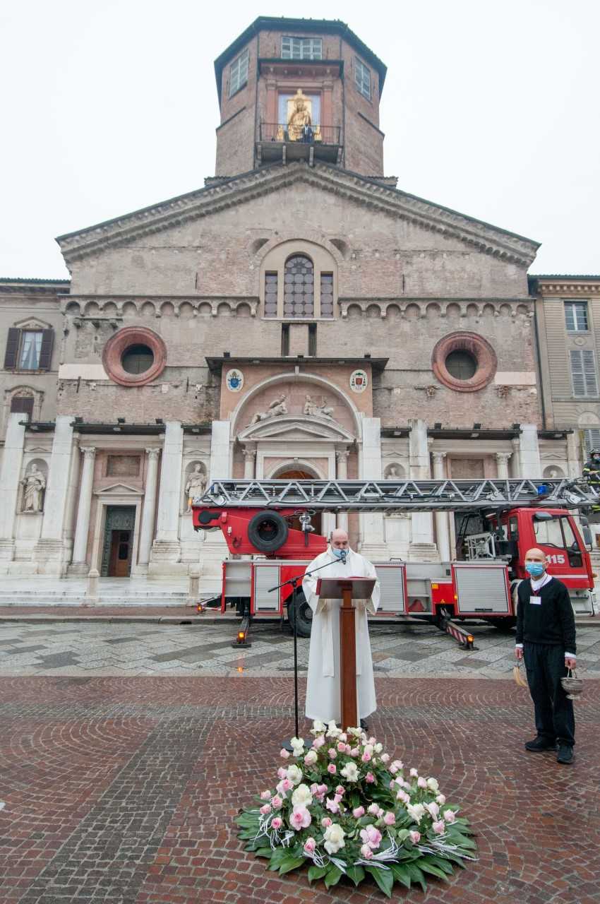 Il primo gennaio 2021 alle ore 9 nella piazza della Cattedrale di Reggio Emilia si è tenuto il tradizionale Omaggio alla Madonna dorata del Duomo, con l’ausilio dei Vigili del Fuoco reggiani.
