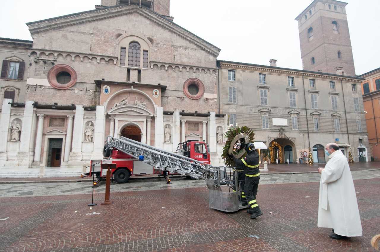 Il primo gennaio 2021 alle ore 9 nella piazza della Cattedrale di Reggio Emilia si è tenuto il tradizionale Omaggio alla Madonna dorata del Duomo, con l’ausilio dei Vigili del Fuoco reggiani.