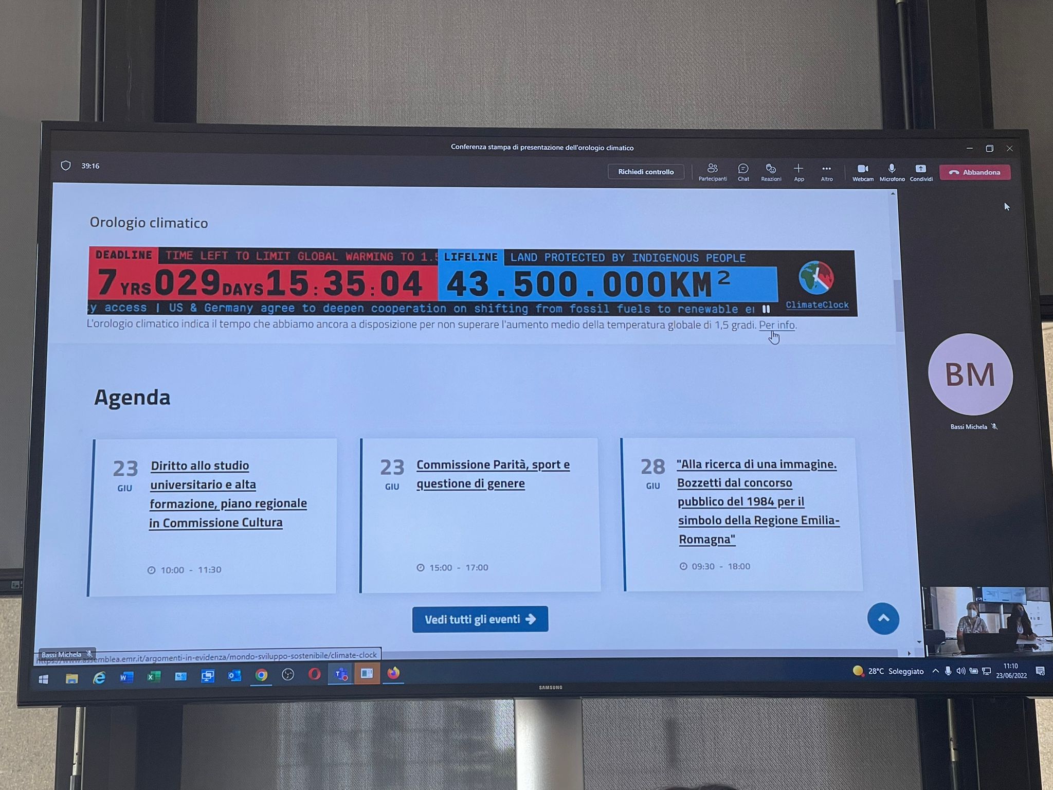 L’Assemblea legislativa della Regione Emilia-Romagna, prima in Italia, attiva l’orologio climatico. Inserito nella home page del nuovo sito istituzionale (https://www.assemblea.emr.it/), l’orologio climatico indica quanto tempo resta (se non si limitano le emissioni inquinanti) all’aumento della temperatura globale di oltre 1,5°C (gradi Celsius), ovvero il limite oltre il quale gli effetti del surriscaldamento sono considerati irreversibili per l’uomo e il Pianeta, così come previsto dagli Accordi di Parigi.