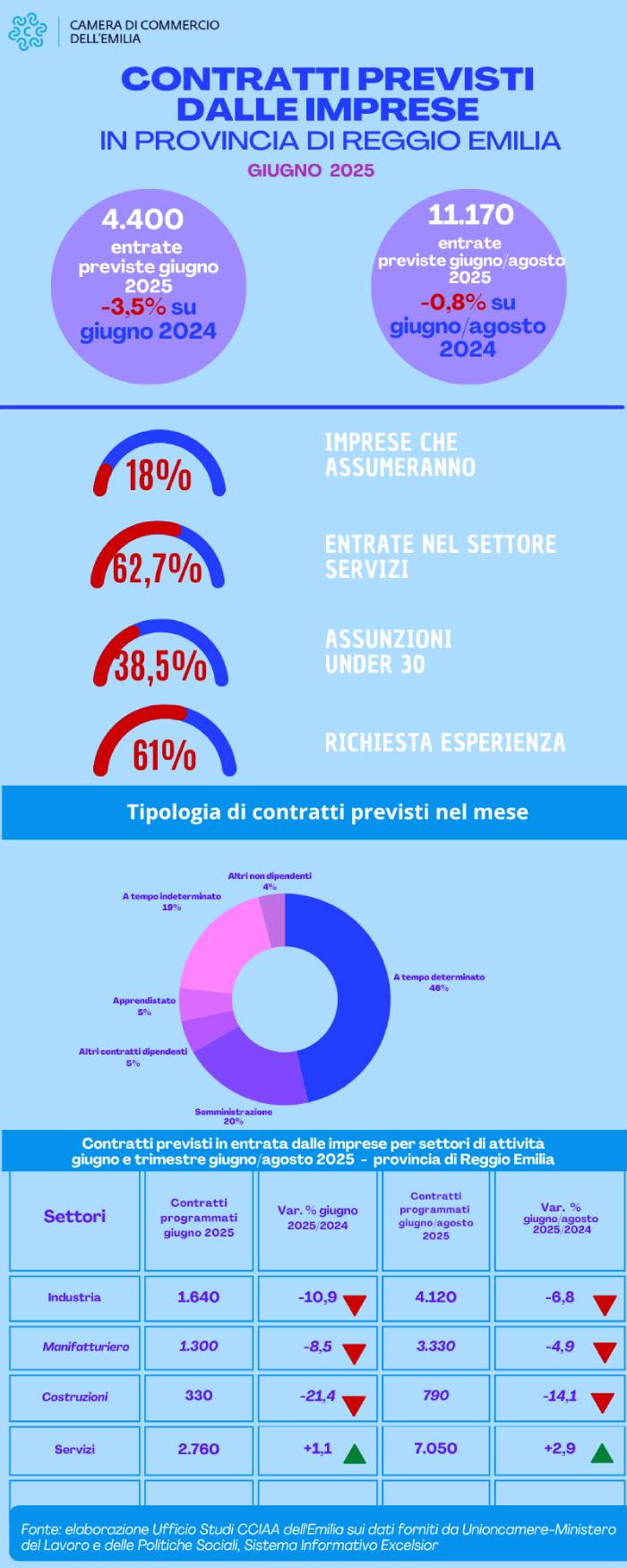 In provincia di Reggio non si arresta la serie di segni negativi (rispetto all’anno precedente) riguardanti il numero di nuovi contratti che le imprese prevedono di attivare. Le 4.400 attivazioni previste a giugno di quest’anno, infatti, rappresentano una flessione del 3,5% (160 contratti in meno) rispetto allo stesso mese del 2024.