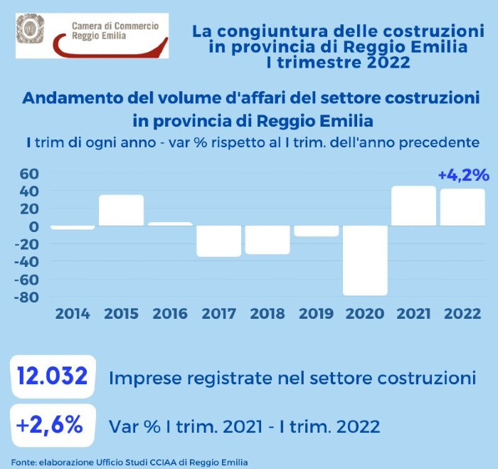 Nonostante si stiano già addensando alcune nubi all’orizzonte, come l’esaurimento dei fondi del Superbonus 110% e l’aumento dei costi dei materiali, in provincia di Reggio il settore edile continua a mantenere buoni livelli di sviluppo. Secondo l’analisi dell’ufficio studi della Camera di commercio di Reggio sui risultati dell’indagine congiunturale relativa al primo trimestre del 2022, infatti, la crescita del comparto rispetto al trimestre precedente si è attestata al 4,2%.