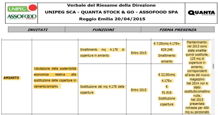 La circostanza è corroborata da un documento, il “Verbale del Riesame della Direzione Unipeg Sca – Quanta Stock & Go – AssoFood Spa” del 20 aprile 2015, che presenta una sezione “Amianto” nella quale si parla di una “Valutazione della sostenibilità economica relativa alla sostituzione delle coperture in cemento/amianto”, che rimanda alla necessità di smaltimento di ben 4.178 metri quadrati di copertura contenente il pericoloso materiale. Secondo la stima presente nel verbale, lo smaltimento dell’amianto avrebbe comportato una spesa complessiva di 29.246 euro, a cui si sarebbero dovuti aggiungere 91.916 euro per la sostituzione della copertura precedente con una nuova copertura senza amianto (“entro il 2015”, si precisava).