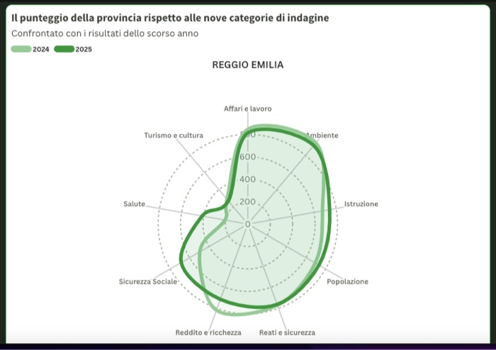 Rispetto ai risultati ottenuti nel 2024, la provincia reggiana ha perso posizioni nelle categorie “affari e lavoro”, “reddito e ricchezza” e, in misura minore, “turismo, intrattenimento e cultura”; è rimasta sostanzialmente stabile per quanto riguarda le categorie “ambiente” e “reati e sicurezza”; ha guadagnato posizioni nella categoria “salute”, seppur in modo lieve, e più marcatamente invece sulle categorie “istruzione” e “sicurezza sociale”.