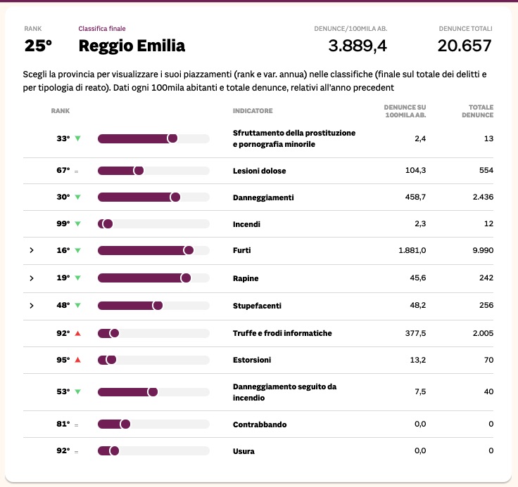 Il quotidiano ha poi stilato anche la classifica del cosiddetto “Indice della criminalità”, misurando il numero di reati denunciati sul territorio di ogni provincia in rapporto alla popolazione residente. In questa speciale graduatoria Reggio è venticinquesima, con un una media di 3.889,4 denunce ogni centomila abitanti: in Emilia-Romagna ha fatto meglio di Bologna (quarta assoluta con 6.055,3 denunce ogni centomila abitanti), Rimini (quinta con 5.995,6 denunce ogni centomila abitanti), Ferrara (sedicesima con 4.255,3 denunce ogni centomila abitanti), Modena (diciassettesima con 4.253,8 denunce ogni centomila abitanti), Parma (diciottesima con 4.166,8 denunce ogni centomila abitanti) e Ravenna (ventiduesima con 4.013,7 denunce ogni centomila abitanti).