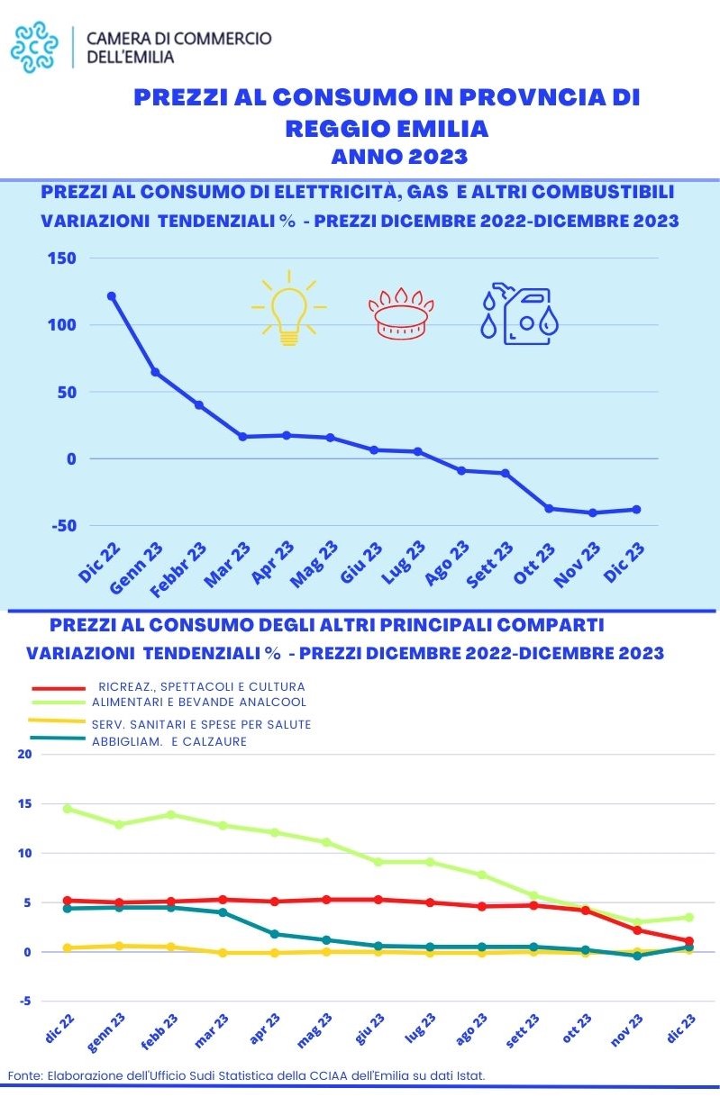 Nel 2023, secondo quanto elaborato dalla Camera di Commercio dell’Emilia su dati Istat, in provincia di Reggio Emilia la variazione media annua dell’indice dei prezzi al consumo ISTAT per l’intera collettività (NIC), rispetto al 2022, è stata pari al +4,4%, in calo rispetto alla variazione media annua 2022 (+7,5% sul 2021), inferiore a quella regionale (+5,2%) ed anche a quella nazionale (+5,7%). Gennaio è stato il mese con l’inflazione maggiore (+9,4%) mentre a dicembre si riscontra non solo la variazione più bassa, ma anche di segno negativo (-0,3%).