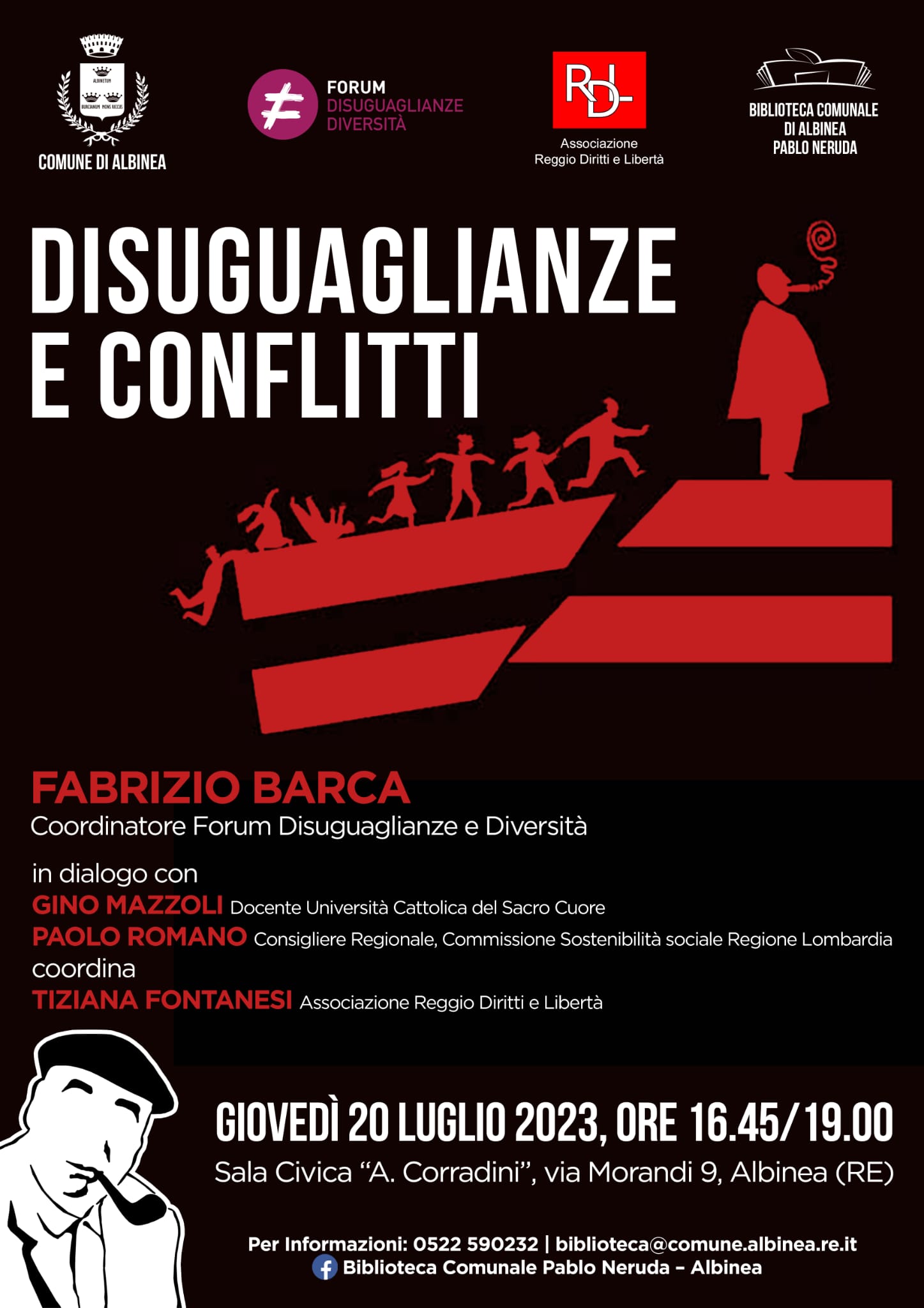 L’Associazione “Reggio Diritti e Libertà”, in collaborazione con la biblioteca comunale “Pablo Neruda” e con l’Amministrazione comunale di Albinea (Reggio Emilia), organizza giovedì 20 luglio, alle ore 16.45, presso la Sala Civica “A. Corradini” l’incontro con Fabrizio Barca, coordinatore Forum Disuguaglianze e Diversità, per riflettere sui temi proposti nel recente dialogo con Fulvio Lorefice “Disuguaglianze e Conflitti, un anno dopo” (edizioni Donzelli).