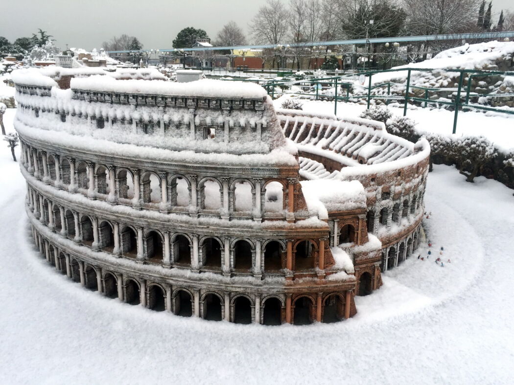 Con meticolosa precisione, la neve riveste il Cupolone del Vaticano, quello del Brunelleschi di Firenze, le due Torri di Bologna e poi il Colosseo, le guglie del Duomo di Milano e pone un candido cappuccio su capitelli, fontane, piazze e tetti degli oltre 300 monumenti in scala del parco, e degli oltre 5000 alberi in miniatura