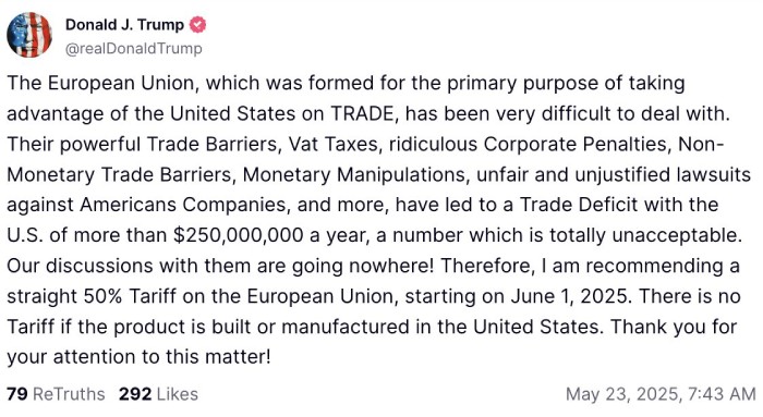 “È molto difficile avere a che fare con l’Unione Europea, che è stata creata con l’obiettivo primario di approfittarsi degli Stati Uniti sul fronte del commercio”, ha scritto Trump, rilanciando un suo (falso) cavallo di battaglia, sottolineando che le trattative con l’Ue “non stanno andando da nessuna parte”.