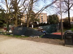 Una nuova segnalazione arrivata oggi da un nostro lettore, che testimonia la “situazione in cui si trova il “deposito di materiali” del cantiere di viale Umberto I – alias passeggiata estense – posto lungo la pista pedonale e ciclabile in prossimità della fontana sita all’incrocio con via Augusto Murri”.
