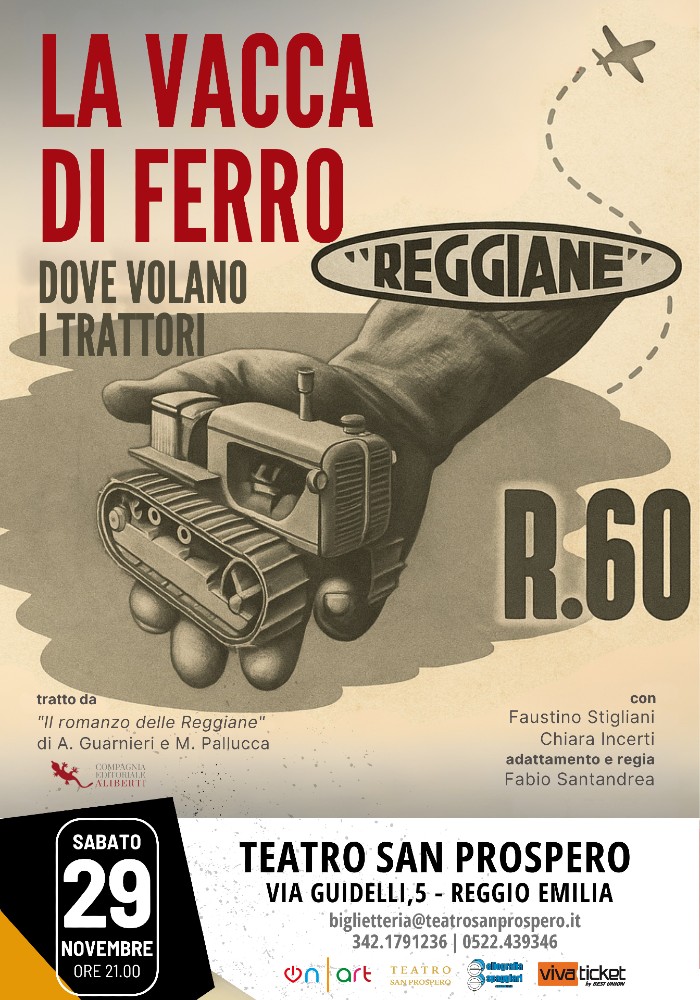 Debutterà sabato 29 novembre alle ore 21 al teatro San Prospero di Reggio lo spettacolo “La vacca di ferro – Dove volano i trattori”, tratto dal libro “Il romanzo delle Reggiane” di Alberto Guarnieri e Micol Pallucca.