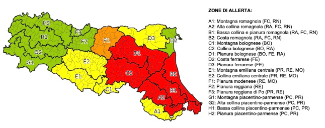 L’allerta è di colore arancione per le piene dei fiumi nelle province di Reggio Emilia e Modena. Gialla per le piene dei fiumi nei territori di Ferrara, Bologna, Ravenna, Forlì Cesena, Rimini e per rischio frane nelle province di Parma, Reggio Emilia, Modena, Bologna, Ravenna, Forlì-Cesena, Rimini.