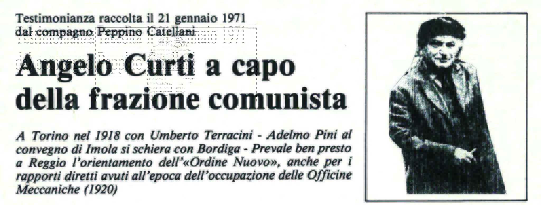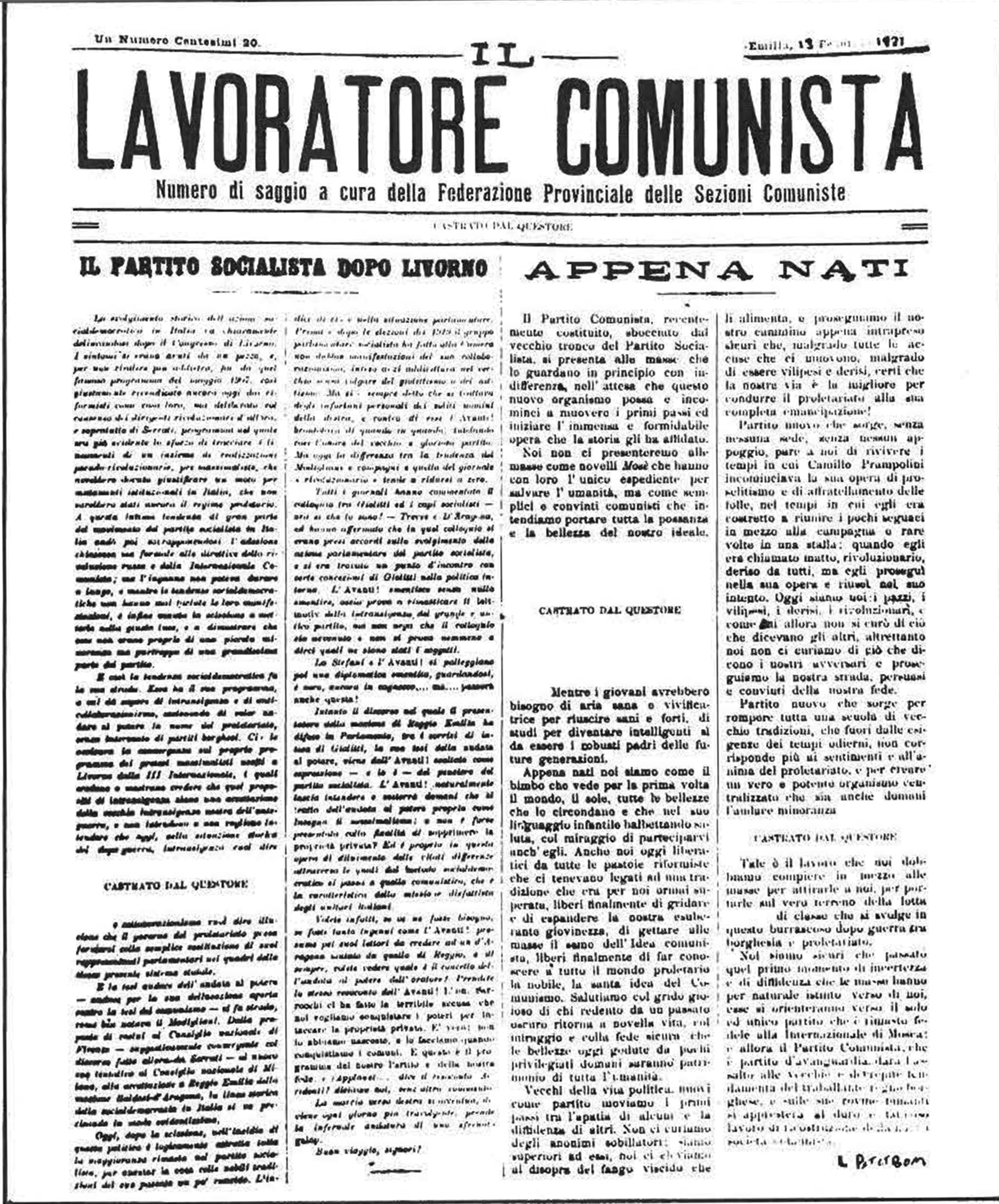 Lodovico Petit Bon, dirigente dei giovani comunisti reggiani – che morirà nel lager di Mauthausen nel 1944 – firma sul giornale un articolo dal titolo “Appena nati”: dove paragona il Partito comunista a un fiore che sboccia. In realtà è un parto fatto con il forcipe voluto dalla “ostetrica” russa, la Terza Internazionale di Lenin, convinta che anche in Italia, dopo la guerra mondiale, ci fossero le condizioni sociali e politiche per una rivoluzione proletaria vittoriosa a patto che nascesse il partito comunista costruito sul modello del partito bolscevico. Il parto col forcipe, si pensi alla sua nascita minoritaria e altamente conflittuale e sofferta, avviene proprio in coincidenza con il progressivo afflosciamento delle bandiere rosse.
