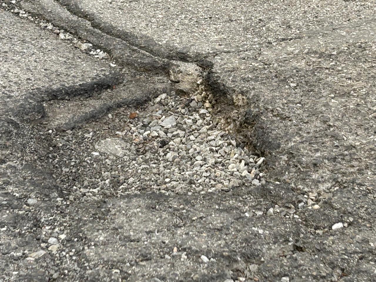 Più che un nastro d’asfalto, la via si presenta come una fetta di gruviera. Un vecchio signore si ferma mentre videamo e ci dice: «Qui non asfaltano, perché non prendono voti». Non sappiamo se questo sia il motivo, tuttavia raccomandiamo ai ciclisti di guardare dove mettono le ruote.