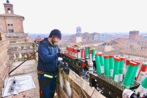 “Ringrazio le aziende e gli addetti coinvolti e anche le forze dell’ordine, i vigili del fuoco, gli operatori sanitari e la polizia locale. Si tratta di un importante evento, ormai conosciuto ovunque come orgogliosamente ferrarese e che crea un sul territorio un indotto importante per il comparto del turismo e del commercio”, aggiunge l’assessore Matteo Fornasini, oggi in sopralluogo sulle torri del Castello insieme al presidente di Ferrara Expo Andrea Moretti, accompagnati dallo staff dello Studio Sigfrida (che ha elaborato il progetto tecnico e si è occupato della parte autorizzativa e della produzione). “Il Castello è un bene patrimonio Unesco, che va protetto. Grazie all’impegno dell’Amministrazione comunale e agli sponsor della città daremo vita a quello che è un momento per i ferraresi di grande unione e di grande festeggiamento in totale sicurezza”, aggiunge Andrea Moretti, presidente di Ferrara Expo e organizzatore dell’evento.
