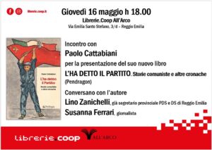 “L’ha detto il partito. Storie comuniste e altre cronache” è l’accattivante titolo della nuova fatica letteraria di Paolo Cattabiani che lo storico cooperatore reggiano – è stato, tra l’altro, presidente di Legacoop Emilia Romagna, Confcoltivatori Reggio e Coop Consumatori Nordest – presenterà giovedì 16 maggio (ore 18) libreria all’Arco, in via Emilia Santo Stefano a Reggio. Converseranno con l’autore Lino Zanichelli, ex segretario provinciale Pds e Ds, e la giornalista Susanna Ferrari.