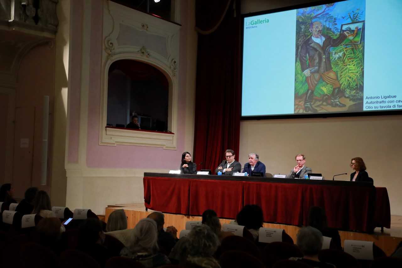 Ai saluti istituzionali di Sabrina Bianchi, responsabile Brand e Marketing Communication e del Patrimonio culturale di BPER Banca (riportati da Greta Rossi in qualità di coordinatrice de La Galleria BPER Banca), e di Davide Zanichelli, direttore della Fondazione Palazzo Magnani, hanno fatto seguito gli interventi di Sandro Parmiggiani e Giorgio Bedoni, che hanno fornito una lettura storico-artistica dell’opera, inserendola nell’economia dei progetti espositivi da loro curati e nel quadro valoriale di due realtà museali particolarmente attente a tematiche relative a diversità, inclusione e accettazione del sé. La tavola rotonda si è conclusa con la relazione di Chiara Bombardieri, responsabile dell’Archivio ex Ospedale psichiatrico San Lazzaro di Reggio Emilia, che ha ricostruito la storia personale di Ligabue e la sua tormentata vicenda psichiatrica, facendo riferimento alle testimonianze documentari e ai testi di approfondimento presenti nel catalogo della mostra modenese.