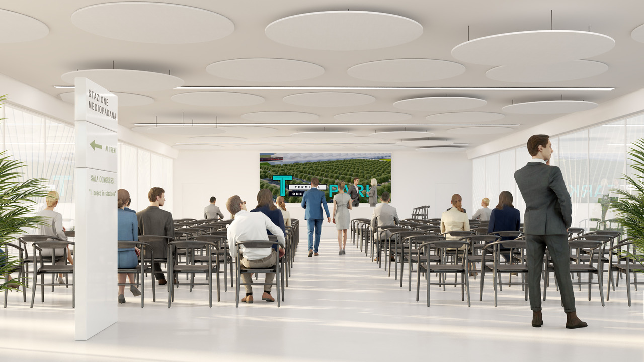 Stazione Mediopadana di Reggio Emilia, ecco i rendering degli interni (spazi di lavoro, ristorazione, spazi espositivi) e degli esterni (sottopasso e parcheggio est).