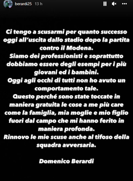 Poco dopo calciatore del Sassuolo si è poi scusato su Instagram per quanto accaduto: “Ci tengo a scusarmi per quanto successo oggi all’uscita dallo stadio dopo la partita contro il Modena. Siamo dei professionisti e soprattutto dobbiamo essere degli esempi per i più giovani ed i bambini. Oggi agli occhi di tutti non ho avuto un comportamento tale. Questo perché sono state toccate in maniera gratuita le cose a me più care come la famiglia, mia moglie e mio figlio fuori dal campo che mi hanno ferito in maniera profonda. Rinnovo le mie scuse anche al tifoso della squadra avversaria”.