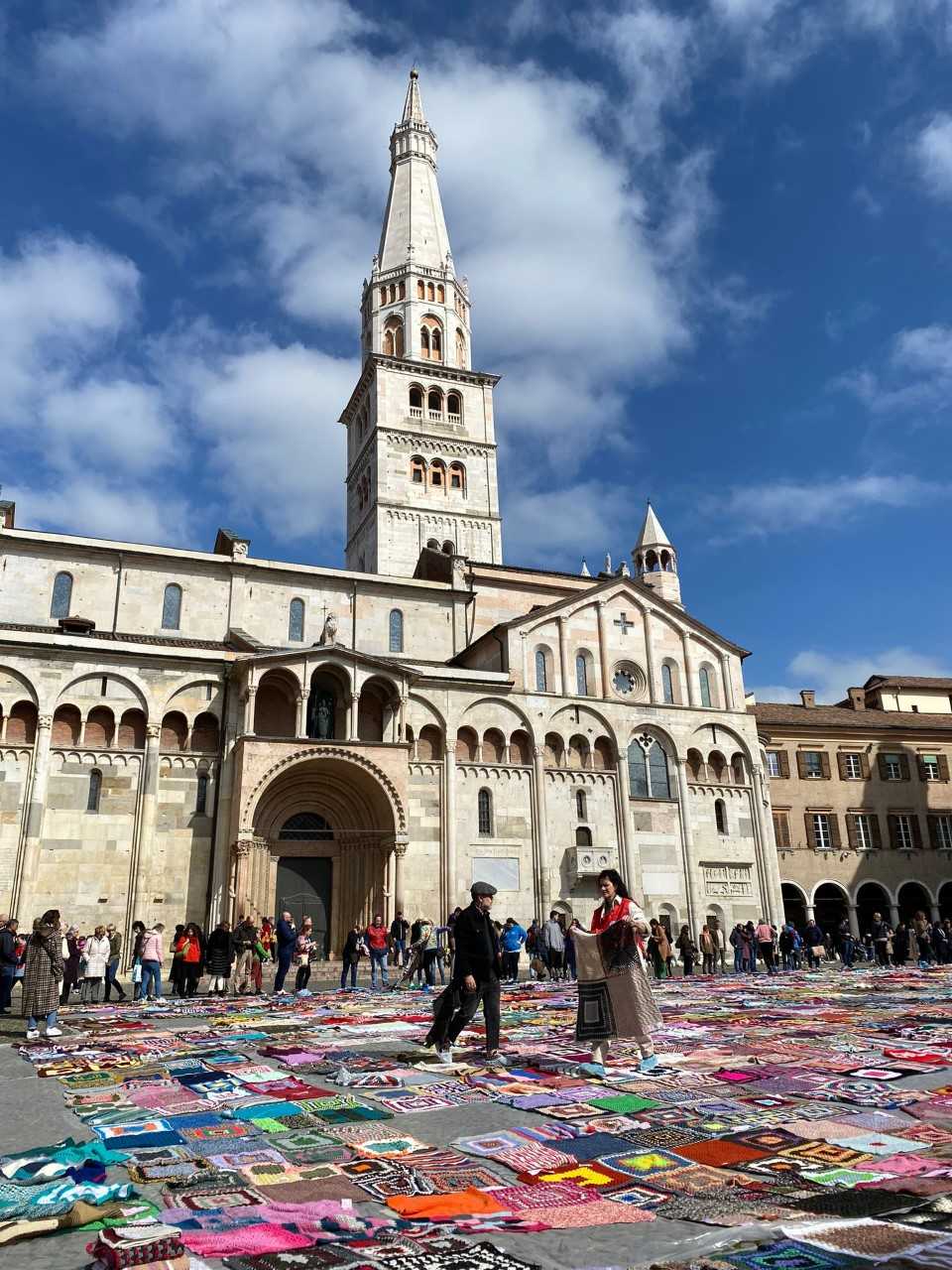Per celebrare la Giornata Internazionale della Donna, a pochi giorni di distanza, Viva Vittoria OdV, sostenuta da Fondazione Conad ETS e dai soci Conad Nord Ovest, ha installato a Modena in Piazza Grande una maxi-coperta realizzata con quasi 4.000 quadrati fatti a maglia dall’intera comunità modenese e cuciti insieme con un filo rosso per sensibilizzare la cittadinanza contro la violenza di genere. Una catena umana di volontarie e volontari ha allestito la Piazza fin dalle prime luci del mattino. Al termine dell’evento, i quadrati di maglia sono stati oggetto di una raccolta fondi per aiutare concretamente l’Associazione Casa delle Donne, che ogni giorno offre nuove opportunità di vita alle donne vittime di stalking e violenza.