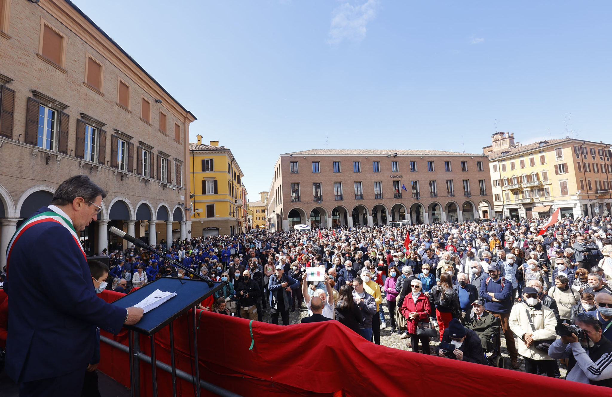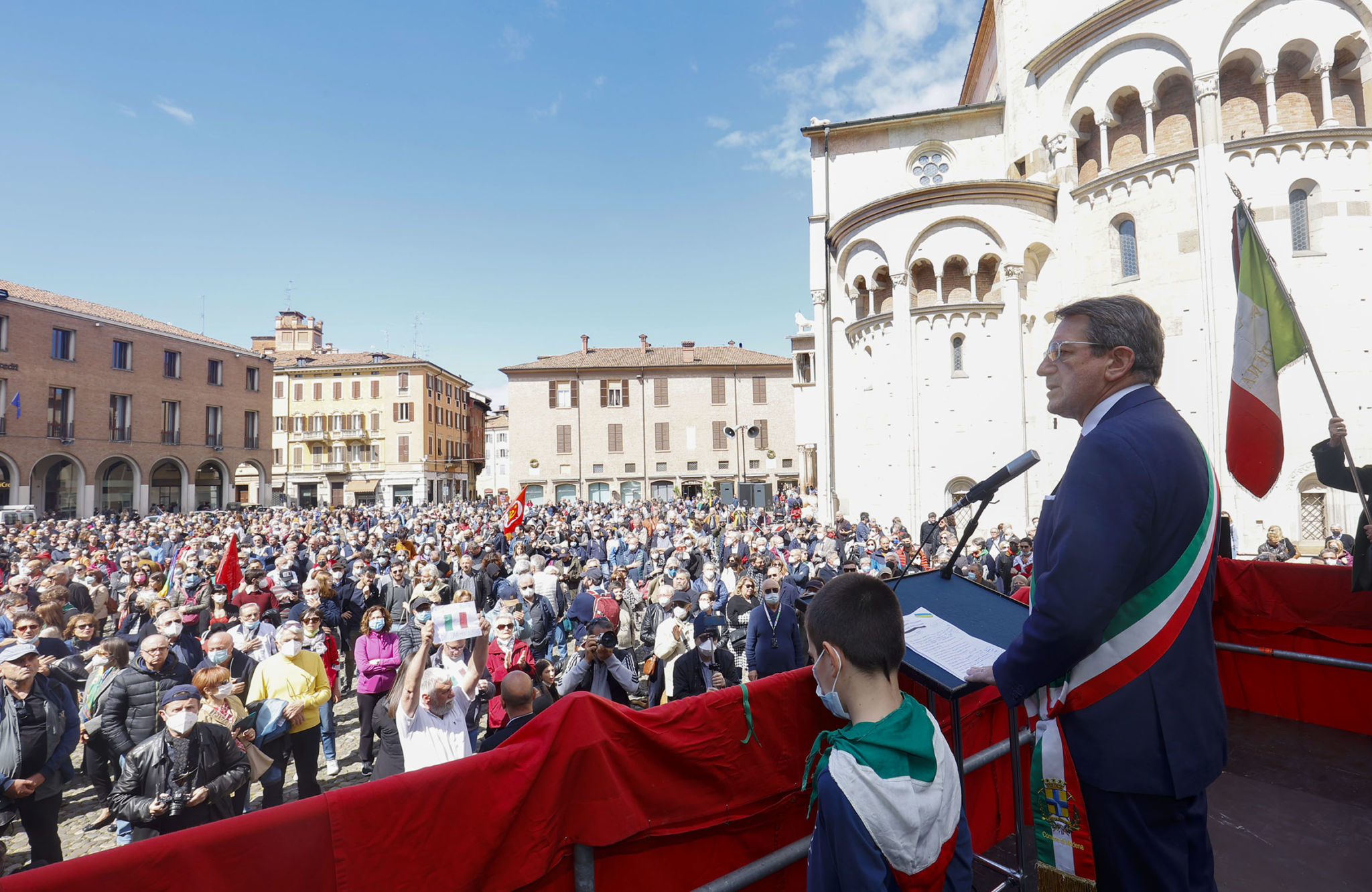 La preparazione, dopo la dittatura fascista, di “un nuovo tempo di libertà”, quello che stiamo vivendo oggi. È ciò che è stata la Resistenza, quella culturale accanto a quella fatta di combattimenti e sacrifici, secondo il sindaco di Modena Gian Carlo Muzzarelli intervenuto in piazza Grande nella manifestazione del 25 aprile, promossa insieme all’Anpi, sottolineando l’importanza di tornare a celebrarla in presenza, dopo le restrizioni del Covid, e con lo sguardo rivolto al futuro, tenendo viva la memoria e rivolgendosi ai giovani: “Possiamo trovare più fiducia e ottimismo se pensiamo che nel momento più buio gli italiani trovarono nella lotta di Liberazione questo coraggio e questa consapevolezza”.
