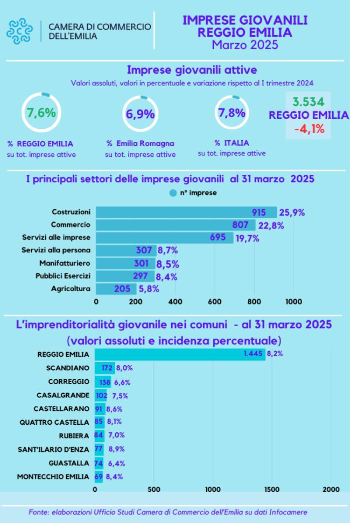 Nel primo trimestre del 2025 sono scese a 3.534 le cosiddette “imprese giovanili” (quelle guidate da imprenditori e imprenditrici con meno di 35 anni) attive in provincia di Reggio. Il dato, riferito al 31 marzo scorso ed emerso dalle analisi dell’Ufficio studi della Camera di commercio dell’Emilia, ha messo in evidenza una flessione del 4,1% (150 unità in meno) rispetto allo stesso periodo dell’anno precedente.