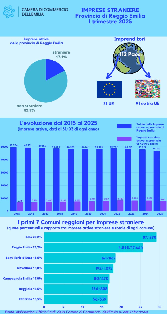 Al 31 marzo scorso, secondo la Camera di commercio dell’Emilia, nel Reggiano le imprese attive guidate da persone straniere erano 8.011, 295 in meno rispetto al marzo dello scorso anno.