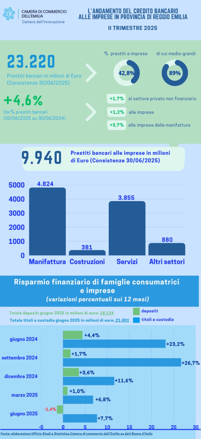 Sul fronte dei risparmi, infine, il dato al 30 giugno 2025 ha mostrato un calo dell’1,4% dei depositi, affiancato da un rilevante aumento dei titoli a custodia, che hanno fatto segnare +7,7% portandosi oltre quota 21 miliardi. Il totale del risparmio reggiano rappresentato da depositi e titoli a custodia presso le banche ammonta complessivamente a 39,1 miliardi di euro, con un aumento di un miliardo e 256 milioni rispetto alla metà del 2024.
