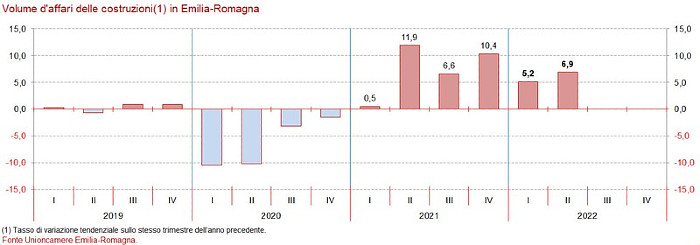 Nel secondo trimestre del 2022, secondo l’indagine congiunturale realizzata dalle Camere di commercio territoriali e da Unioncamere Emilia-Romagna, ha trovato conferma la robusta tendenza di crescita dell’industria delle costruzioni emiliano-romagnola, spinta in terreno positivo dai vari bonus nazionali nonostante i limiti di offerta (per quanto riguarda disponibilità di imprese, di lavoratori e di materiali), i notevoli incrementi dei listini dei prezzi e l’inizio di un’attività di controllo da parte pubblica.