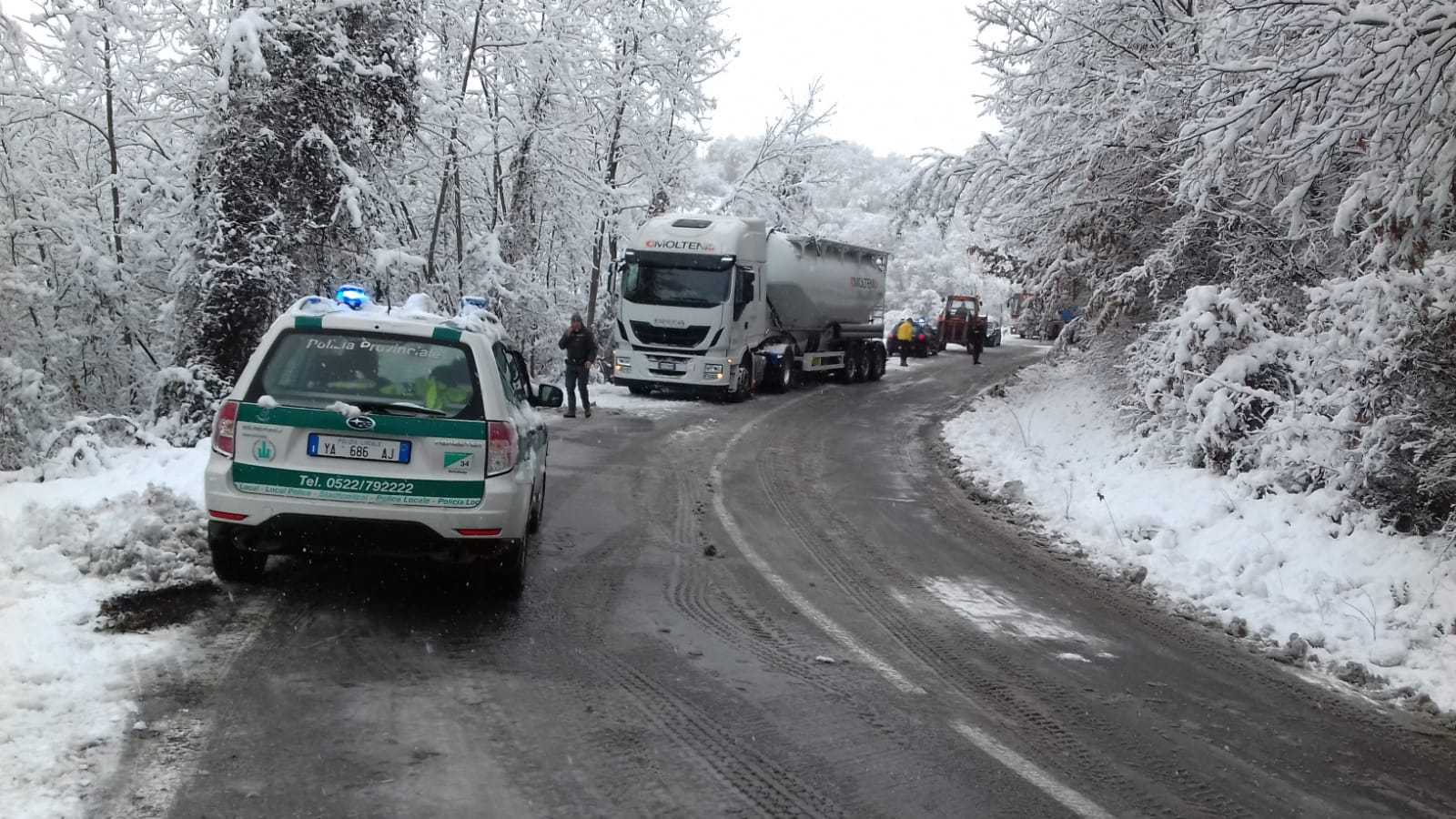 Polizia provinciale e carabinieri impegnati anche sulla Sp 9, tra Felina e Gatta di Castelnovo Monti, dove verso le 8.30 due autotrasportatori che stavano scendendo a valle si sono trovati in difficoltà, nonostante la strada fosse percorribile, ed hanno accostato. I due autoarticolati, infatti, non avevano pneumatici da neve: entrambi i camionisti sono stati aiutati a montare le catene e a ripartire, non prima di essere stati contravvenzionati.