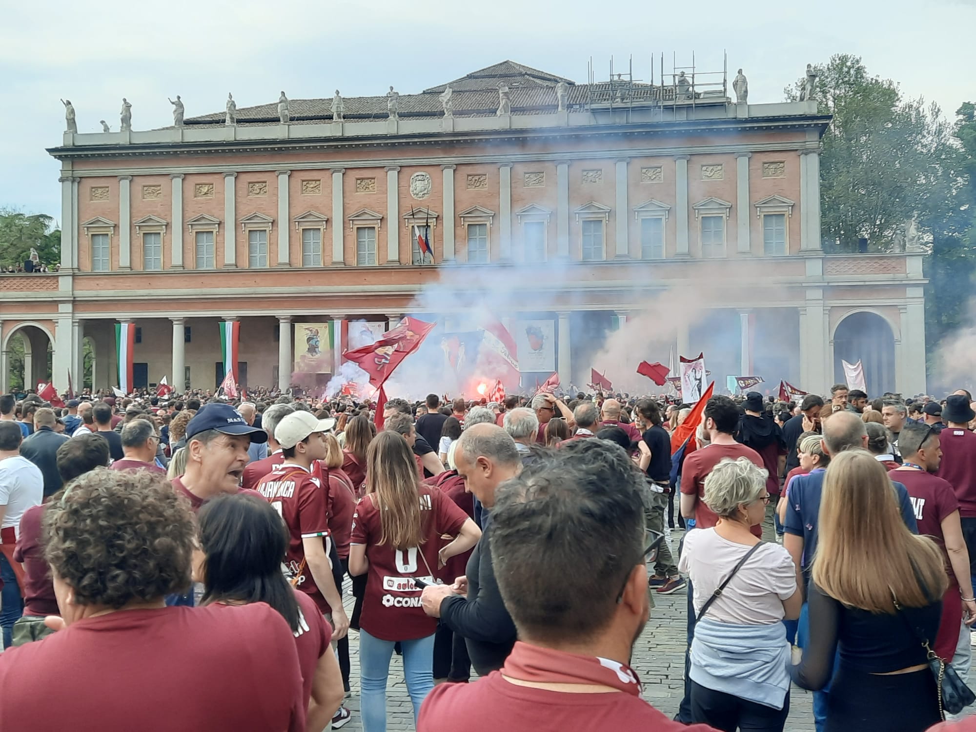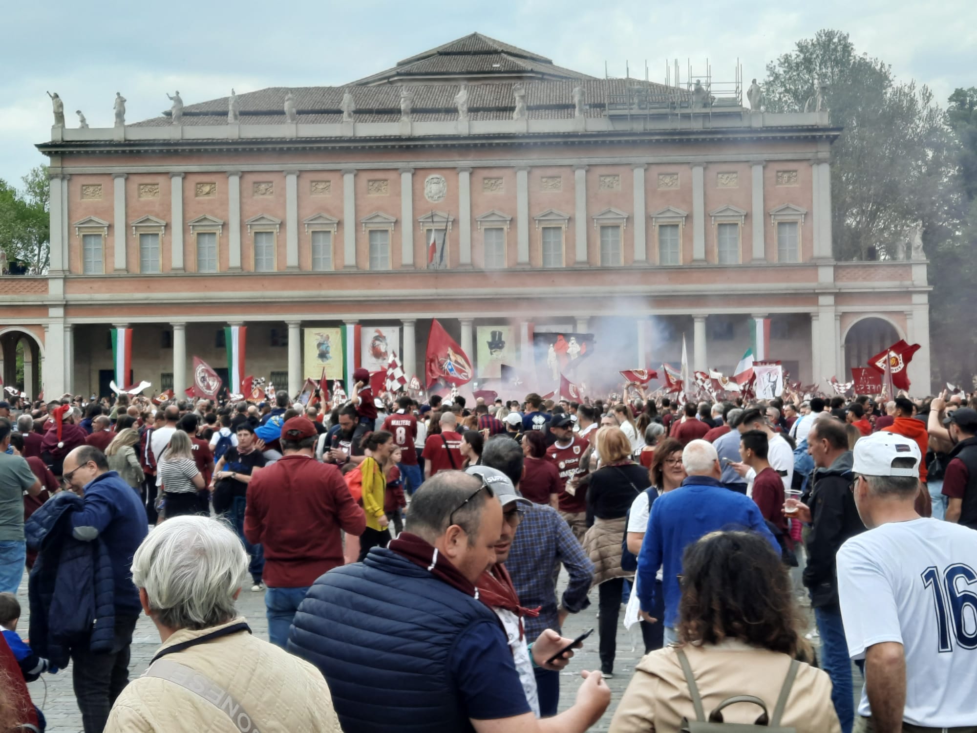 Piazza della Vittoria invasa dal tifo granata, tra cori, fumogeni e striscioni, con il pullman scoperto che portato in trionfo i giocatori acclamati dalla folla.