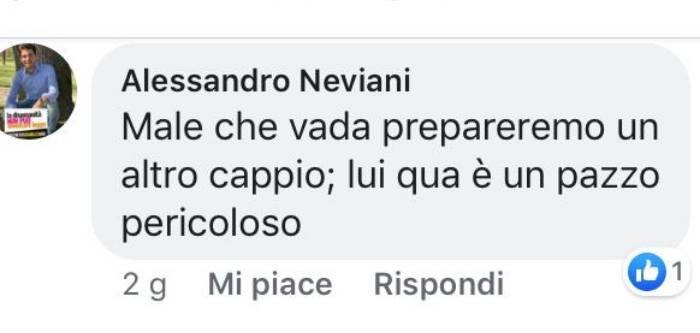 “Mal che vada prepareremo un altro cappio, lui qua è un pazzo pericoloso”: una battuta di cattivo gusto, pubblicata su Facebook sotto l’articolo di un quotidiano e riferita al leader della Lega Matteo Salvini, ha fatto finire nella bufera Alessandro Neviani, giovane consigliere comunale del Partito Democratico di Formigine.
