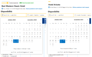 Stesso folle aumento perfino all’hotel Ariosto, un 2 stelle in centro storico accreditato su Booking come “passabile” (un modesto 5,7 di voto medio, in base a quasi 600 recensioni): 277 euro (contro i 61 euro dei restanti venerdì di ottobre e novembre) per una camera con due letti singoli (tipo quella della foto qui sopra). L’hotel La Rosta, altro due stelle ma in via Passo Buole quindi da tutt’altra parte della città, ha solo una tripla al “modico” costo di 289 euro, contro i 114 che basterebbero sempre per 3 posti-letto in un qualsivoglia venerdì di novembre.